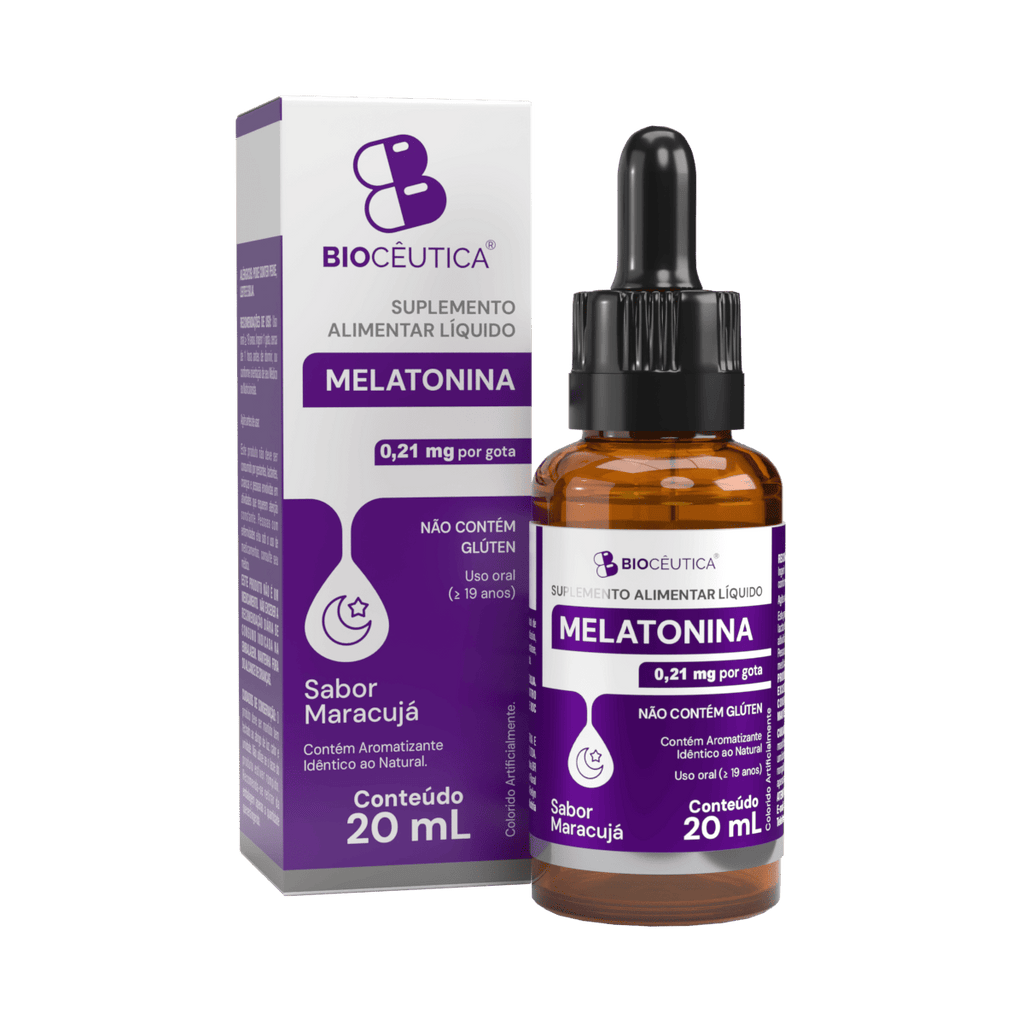 O suplemento Melatonina em Gotas 20 ml Bioceutica é um produto líquido formulado com melatonina, um hormônio naturalmente produzido pelo organismo cuja principal função é regular o ciclo sono-vigília e sinalizar ao corpo quando é hora de descansar. A apresentação em gotas com sabor natural de maracujá possibilita dosagem personalizada e fácil absorção pelo organismo, oferecendo conforto e praticidade para quem deseja melhorar a qualidade do sono.