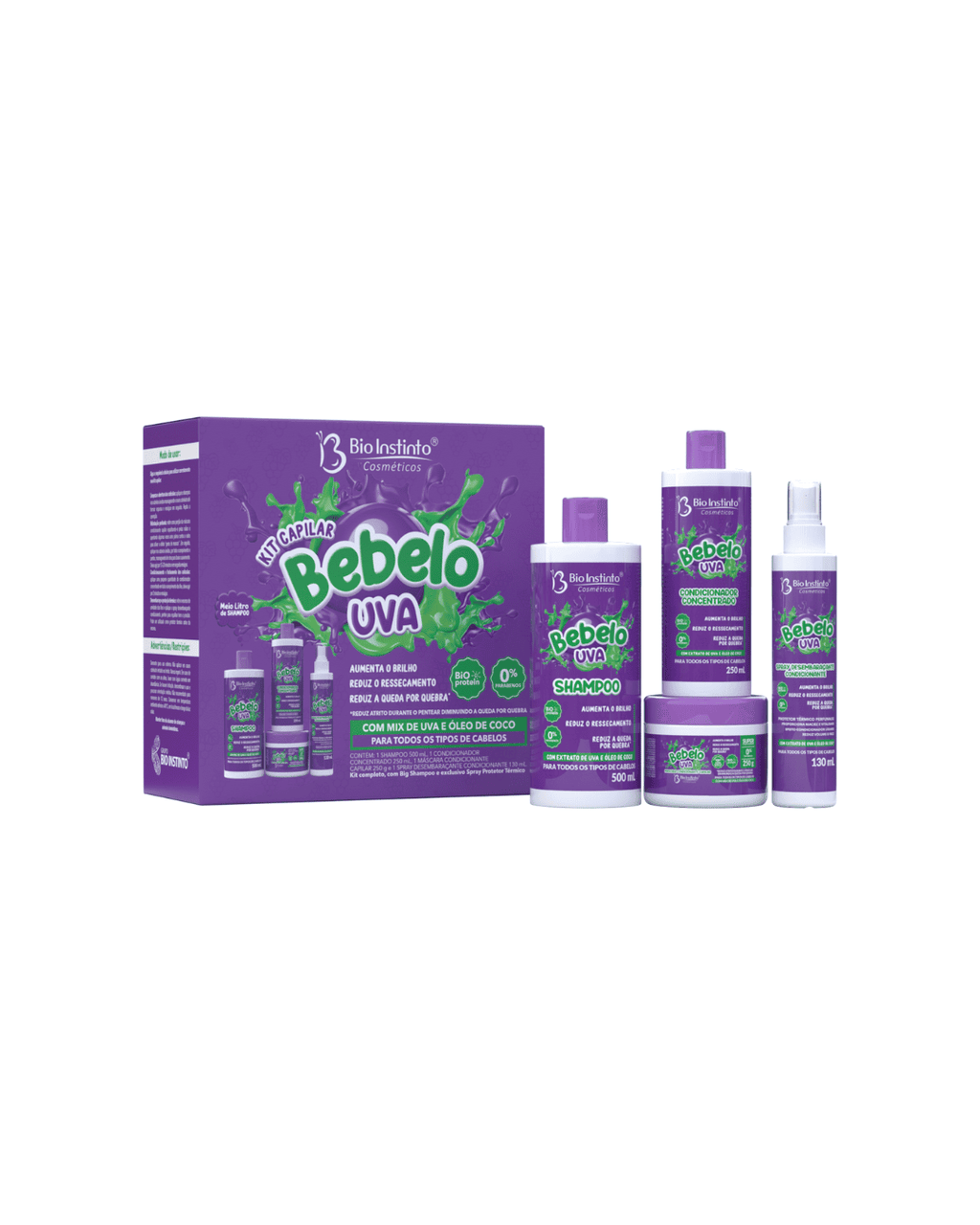 O Kit Capilar Bebeloo Uva irá reduzir o ressecamento, a queda pro quebra e o aumento de brilho, com extrato de uva e Óleo de Coco ele trás em sua fórmula a tecnologia Bio Protein e 0% Parabenos.