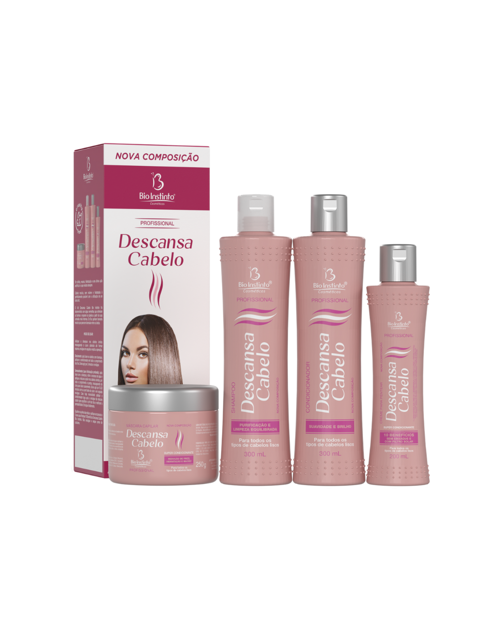 O Kit Descansa Cabelo Bio Instinto foi desenvolvido com algas vermelhas que eliminam as toxinas e repara os cabelos a partir de suas camadas mais internas. Os fios ganham tamanha maciez que parecem desmaiar entre os dedos.