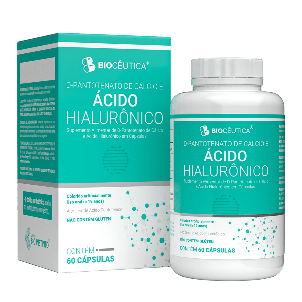 Produto com ácido hialurônico associado a substâncias que favorecem a biodisponibilidade e potencializam seus efeitos, como D-pantotenol (derivado da vitamina B5) e outros excipientes para formulação em cápsulas.