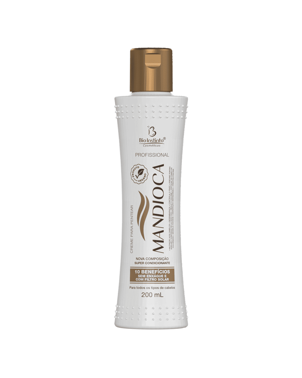 O Creme de Pentear 10 benefícios Mandioca Bio Instinto é um produto criado para todos os tipos de cabelos que desejam ficar macios, hidratados e livre de frizz. Sua fórmula desenvolvida com extrato de mandioca contém minerais, vitaminas e extratos nutritivos que conseguem repor a massa capilar sem deixá-los pesados ou engordurados. Excelente opção para pré/pós piscina. Rico em Óleo Natural de Amêndoas.